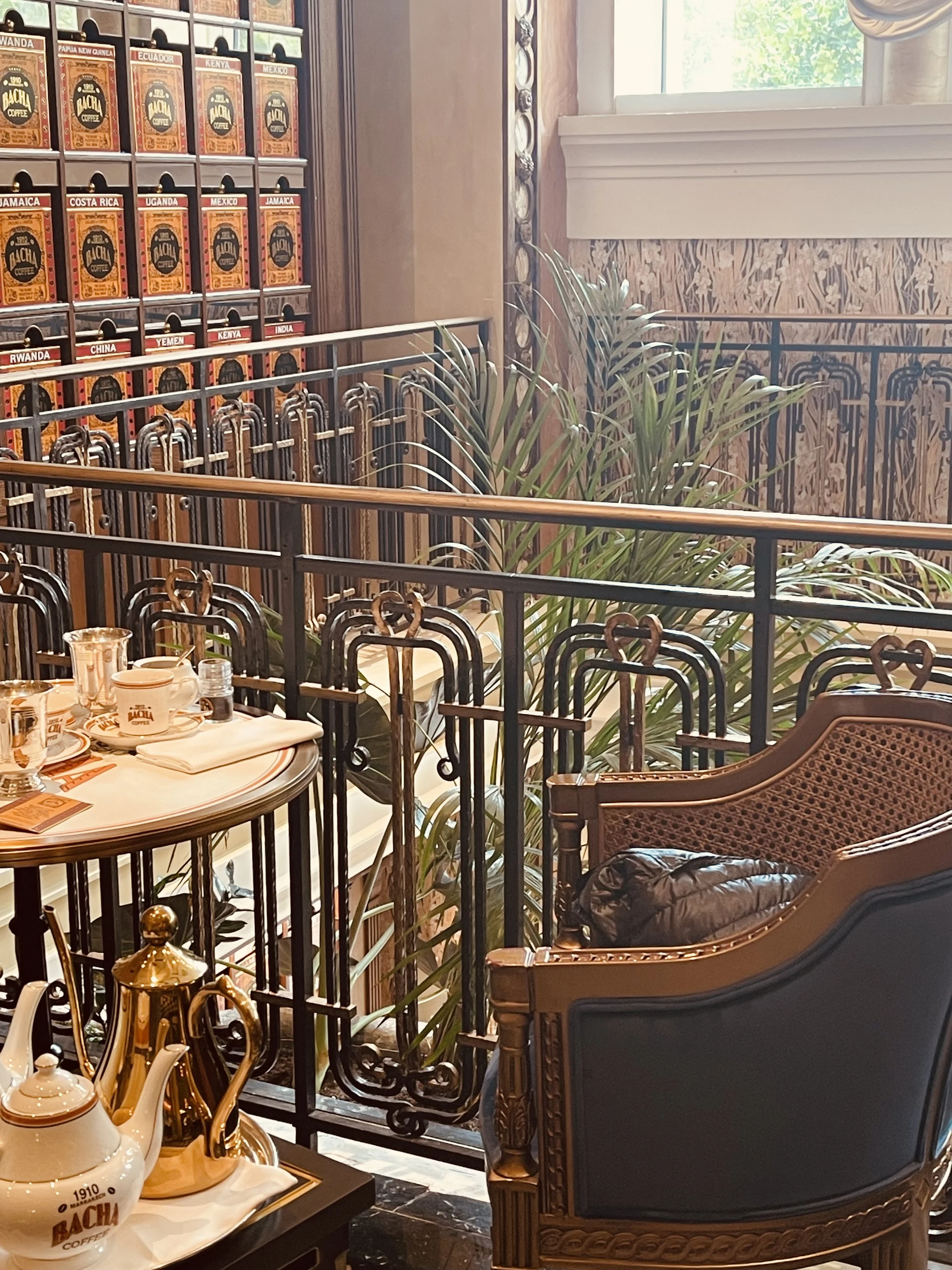 Op nummer 26 van de Champs-Élysées vind je Bacha Coffee, een adres dat je eigenlijk niet mag overslaan. Zelf ga ik niet vaak naar de Champs-Élysées, maar dit adres zit aan het begin en kun je makkelijk combineren met een bezoek aan het Grand Palais of Avenue Montaigne. Binnen word je verwelkomd door hoge houten kasten, koperkleurige potten en een menukaart met meer dan tweehonderd koffiesoorten. Elke koffie wordt geserveerd in een glanzende pot met kristalsuiker, room en een klein gebakje ernaast. Hier drink je geen koffie, maar beleef je koffie.